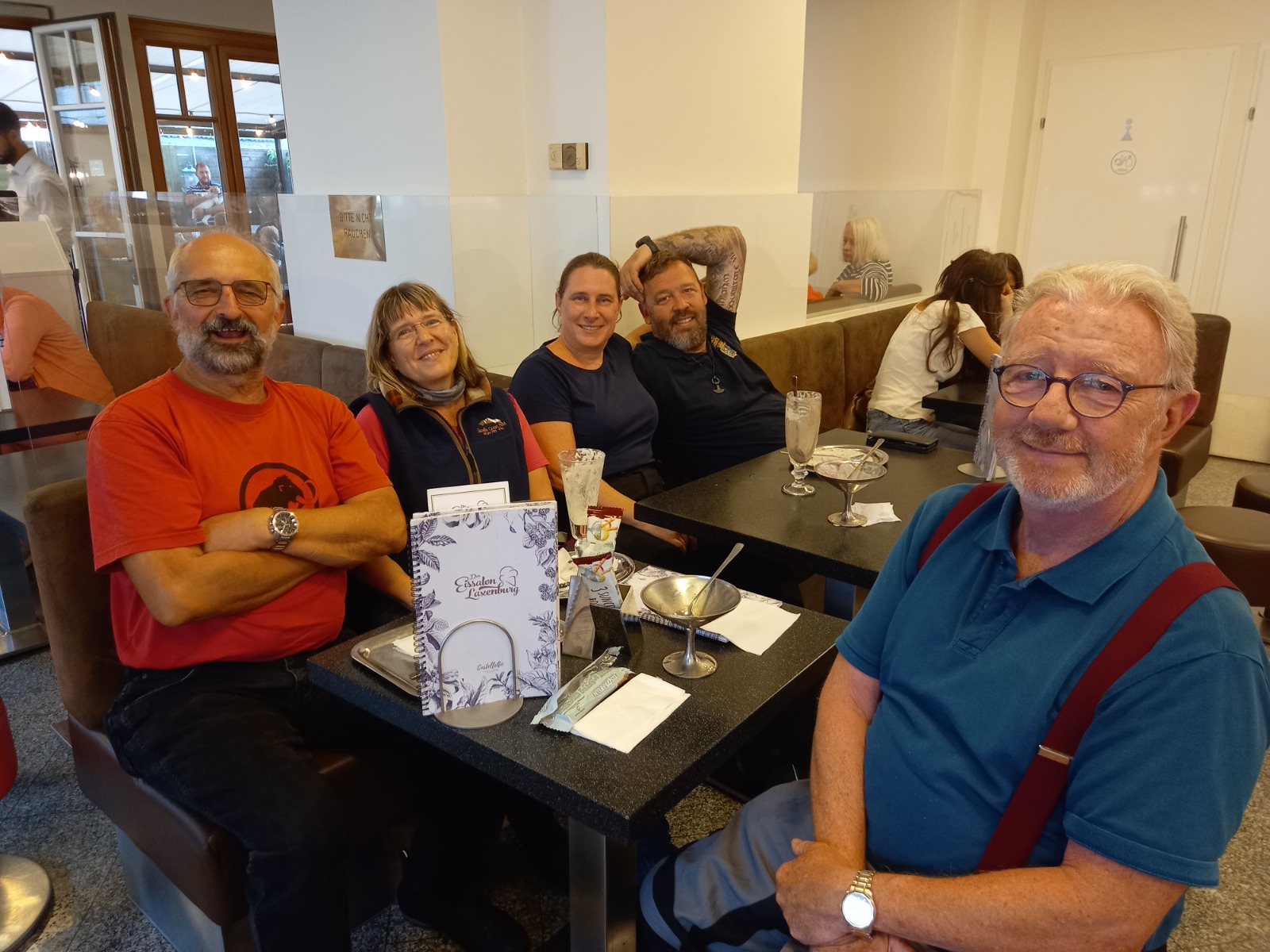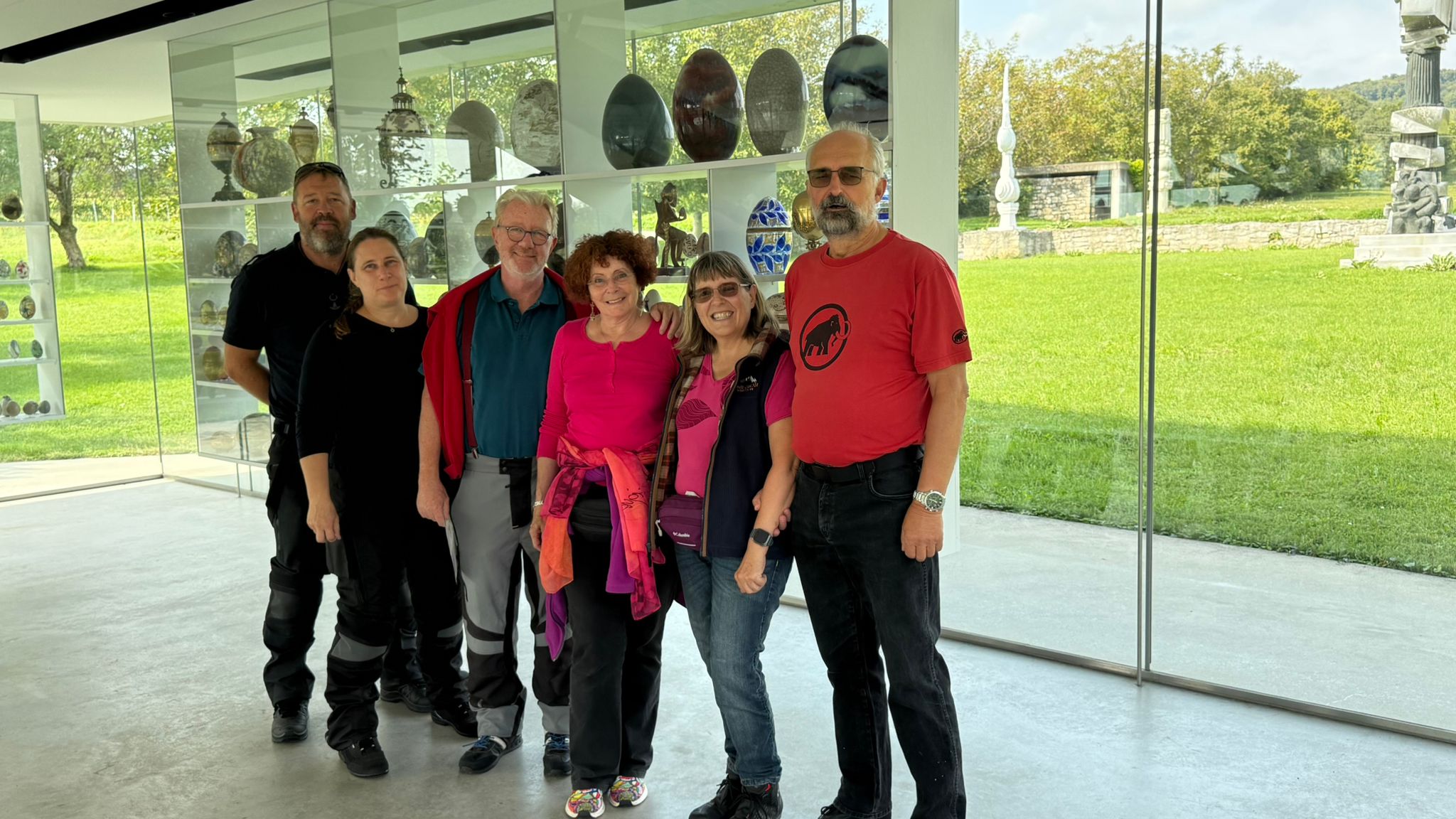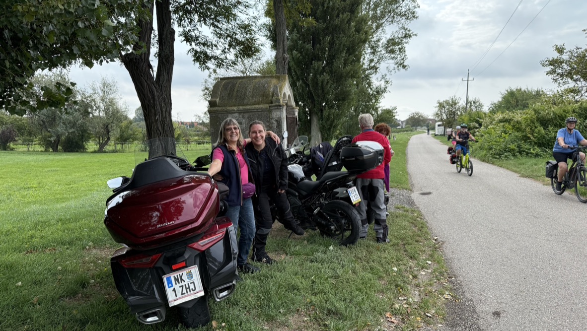 In der Frueh hatte es am Samstag den 13. Sept. 25 noch geregnet, bei uns bis ca 08:00 Uhr, Wien und Umgebung bis ca. 10:00 Uhr. Die Wetter Apps sagten aber ab 10 trockenes Wetter voraus, so fuhren wir gegen 09:00 zu unserem Treffpunkt McDonalds nach Schwechat. Unsere Freunde warteten schon auf uns und so konnten wir uns noch gemeinsam einen Kaffee mit Leckerli genehmigen, ist auch das Einzige was ich dort esse! Um 10:30 fuhren wir gemeinsam los, der B10 folgend und über Sommerein, Kaisersteinbruch nach Breitenbrunn und nach Winden zum Freilichtmuseum Wander Bertoni. Hier bekamen wir einen Einblick ins schaffen des Kuenstlers und ueber seine Eier Sammlung. Diese Werke wurden besichtigt und wir hatten viel Spass dabei. Mittag machten wir dann beim Heurigen Schemitz in Donnerskirchen ! Und weil wir noch ein Eis wollten, fuhren wir noch nach Laxenburg zum Castelletto. Kurz vorm Ort, die Wolken sprachen schon ihre Baende, fing es zu regnen an, als wir schon saßen fing es zu Schuetten an! Das Eis schmeckte uns trotzdem, und der Spuck war ja auch nach einer halben Stunde wieder vorbei. Hier war auch der Ort, wo wir wieder auseinander gingen und getrennte Touren nach Hause nahmen.